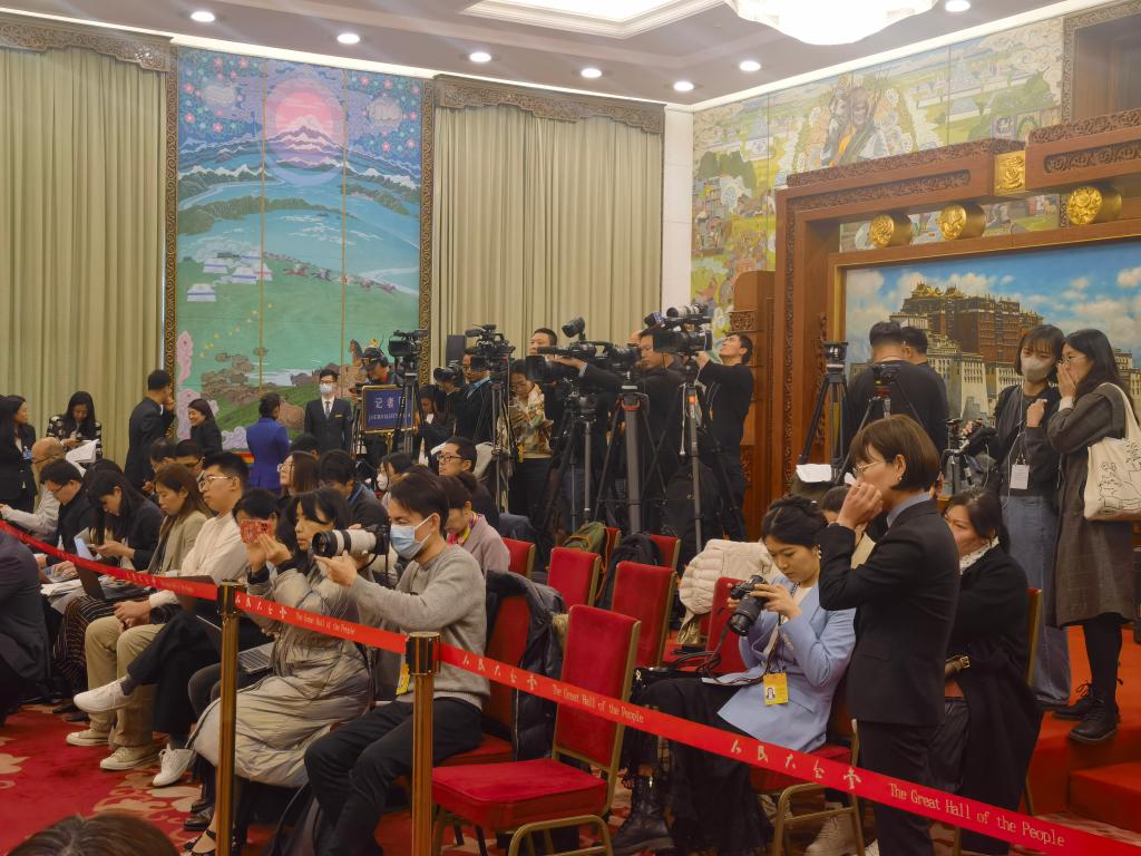 3月6日下午,中外記者在人民大會(huì)堂西藏廳參加十四屆全國(guó)人大二次會(huì)議西藏代表團(tuán)開放團(tuán)組活動(dòng)。(新華社記者韓潔 攝)