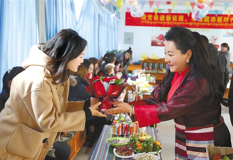 “三八”國際勞動婦女節(jié)來臨之際,山南市瓊結(jié)縣中心醫(yī)院組織醫(yī)院婦女職工一起慶祝節(jié)日。圖為瓊結(jié)縣中心醫(yī)院院長巴桑潘多(右)為醫(yī)院婦女職工獻(xiàn)上鮮花。 倫珠澤仁 洛桑 攝