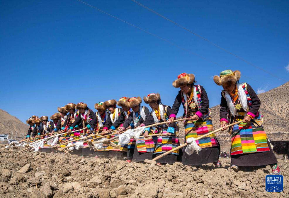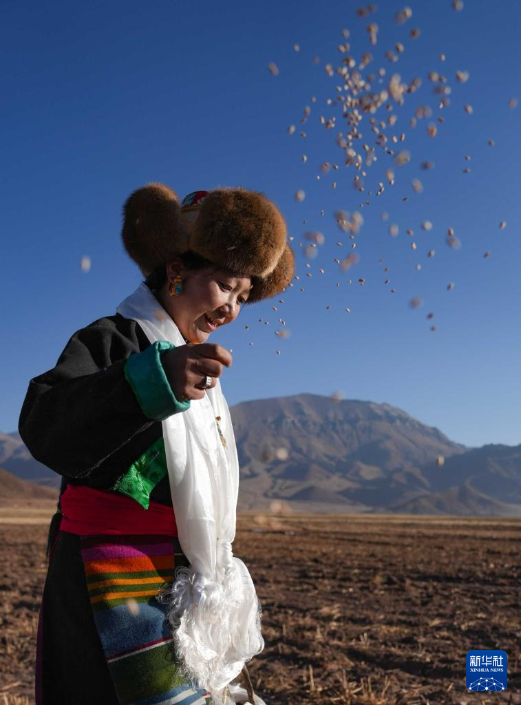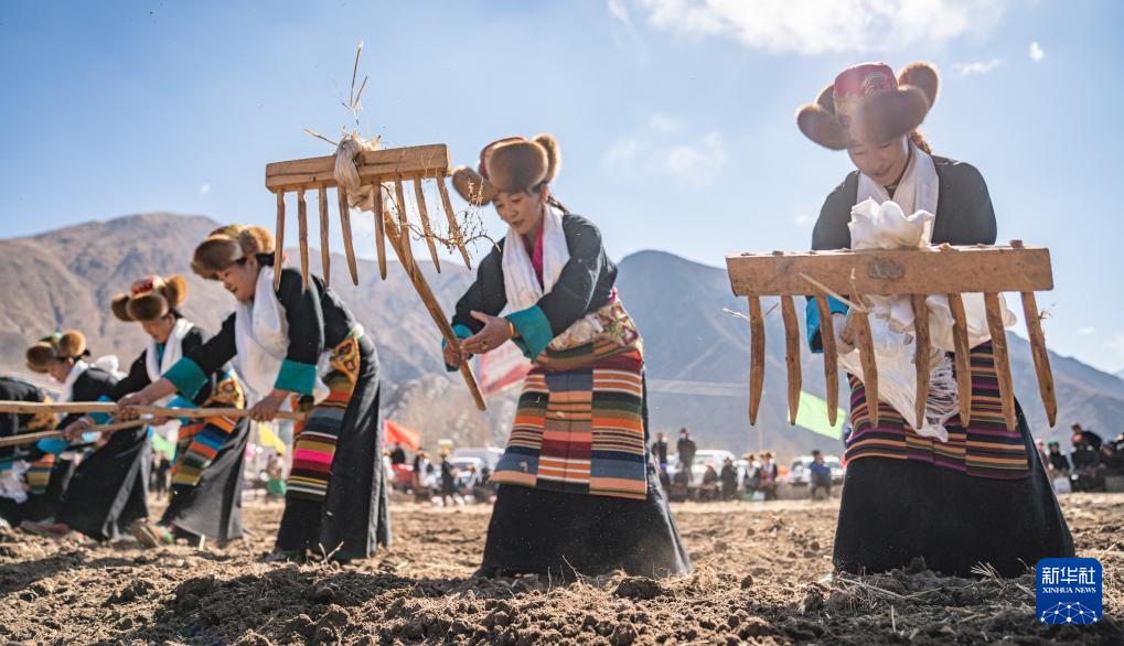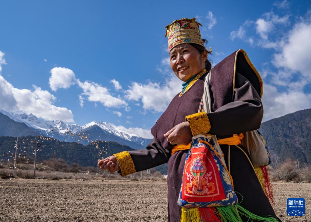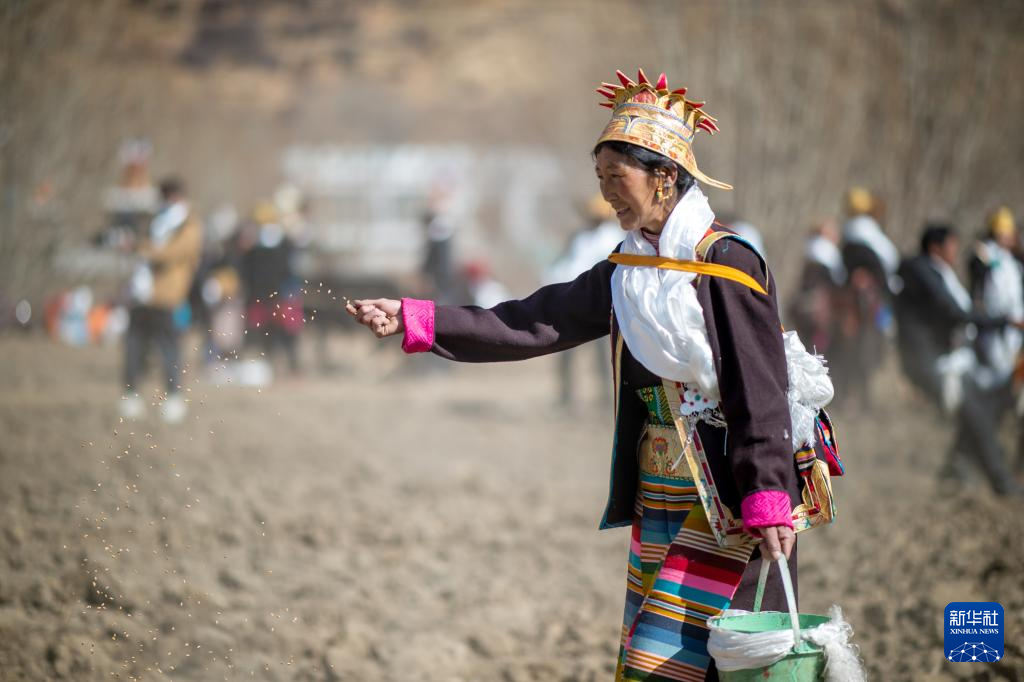 當(dāng)日是西藏農(nóng)民舉行一年一度春耕大典的日子。村民沿襲著傳承千年的春耕民俗,身著節(jié)日盛裝,手捧“切瑪”(五谷豐登斗),唱起祈愿歌,互敬青稞酒。當(dāng)鐵犁翻開土地,婦女將手中的種子撒下,祈求新的一年豐收。