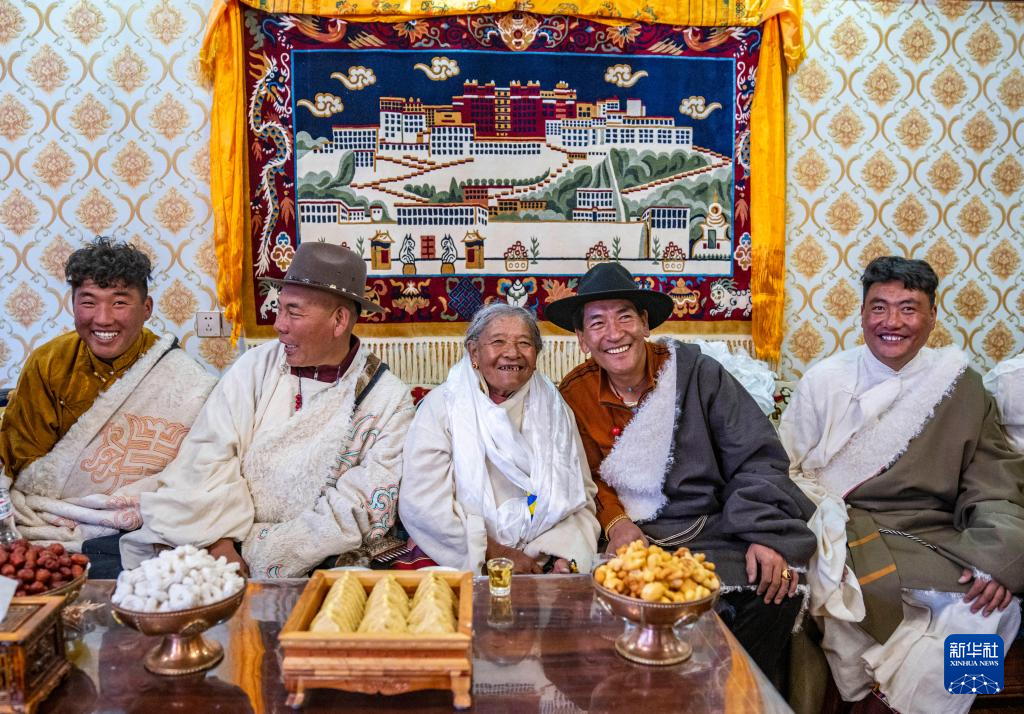 2024年藏歷新年,斯曲旺姆的兒女們帶著各自的小家庭來甲根村團聚,孩子們依次給老人獻上哈達(dá)、敬上青稞酒。斯曲旺姆被滿堂兒孫圍坐中間,歡歌笑語回蕩在明亮寬敞的客廳里。