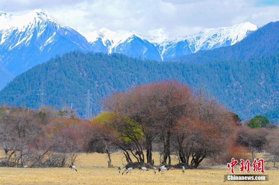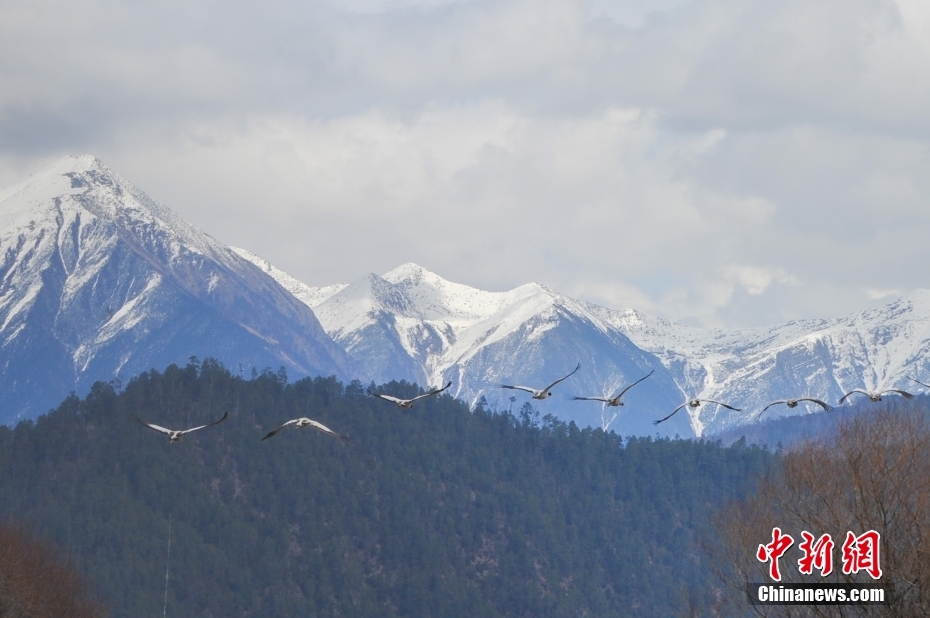 西藏林芝:黑頸鶴與雪山共舞