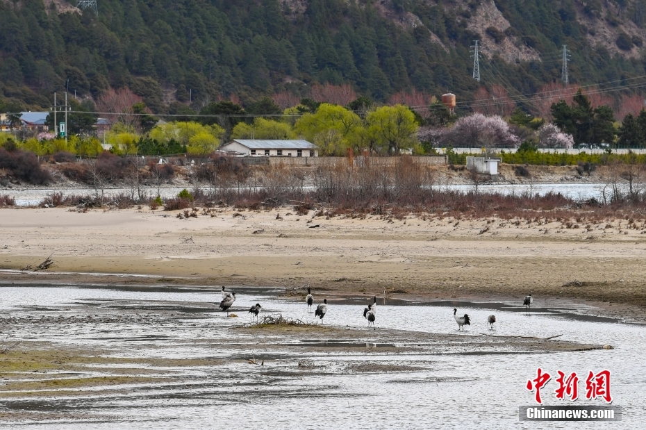 3月30日,在西藏林芝市巴宜區(qū)更章門巴民族鄉(xiāng),黑頸鶴與周邊的村莊、桃花、雪山融為一體,成為春日里的一道靚麗的風景線。圖為黑頸鶴在河邊覓食嬉戲。