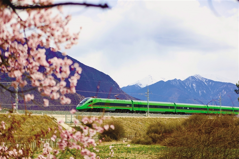 自2021年拉林鐵路開(kāi)通以來(lái),“搭乘復(fù)興號(hào)去看桃花”已成為更多游客的選擇。作為連接“日光城”拉薩和“雪域江南”林芝的“新天路”,拉林鐵路串起了西藏東南地區(qū)的“精華”風(fēng)景,乘坐拉林鐵路列車,不僅能體驗(yàn)到世界最高海拔運(yùn)行的動(dòng)車速度,還可以透過(guò)車窗盡情欣賞雅魯藏布江兩岸壯觀的桃花林,飽覽雪域高原的壯麗美景。