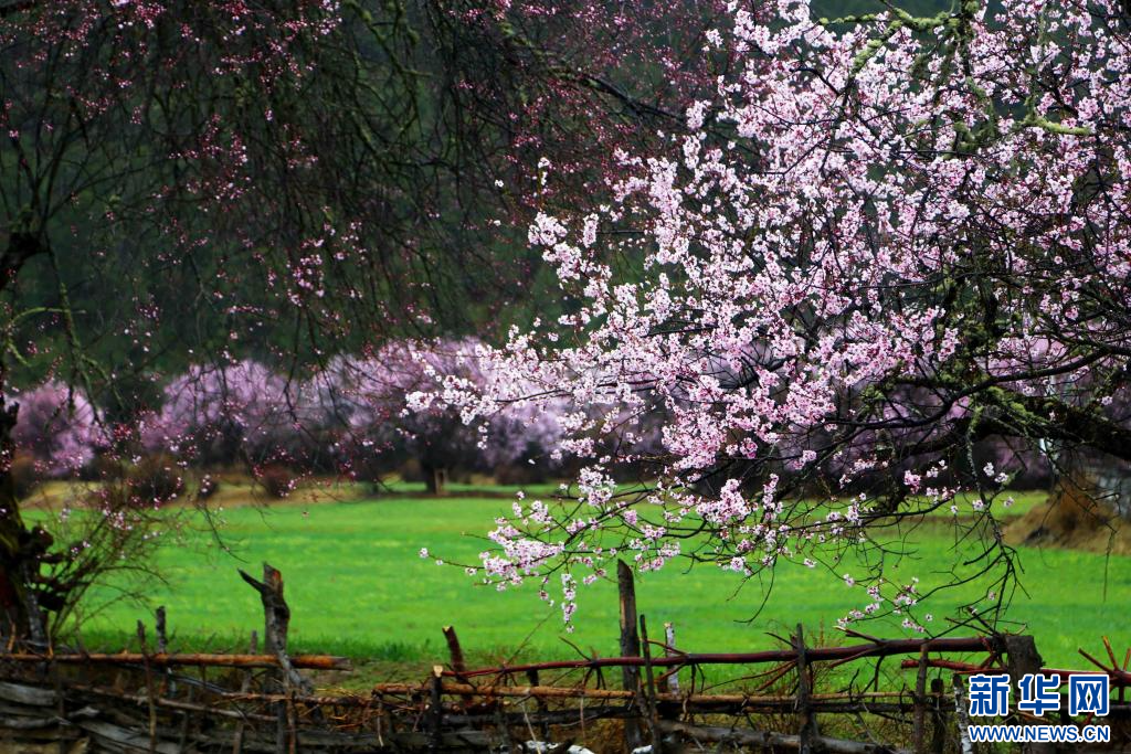 圖為西藏波密縣傾多鎮(zhèn)巴康村內,桃花映襯下的綠草。新華網發(fā) 阿旺仁青 攝