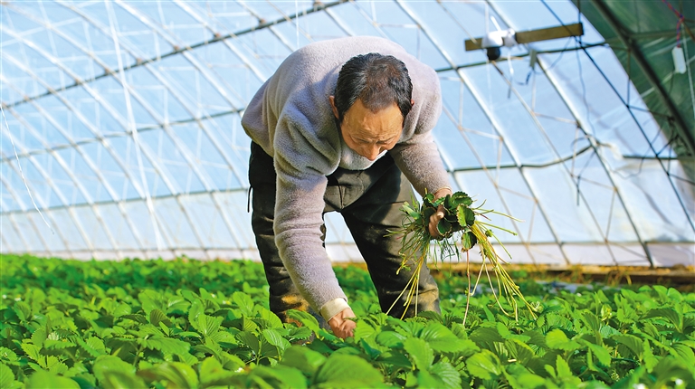 圖為吞彌現(xiàn)代農業(yè)產業(yè)園種植人員在草莓種植大棚內除雜草。記者 鹿麗娟 攝