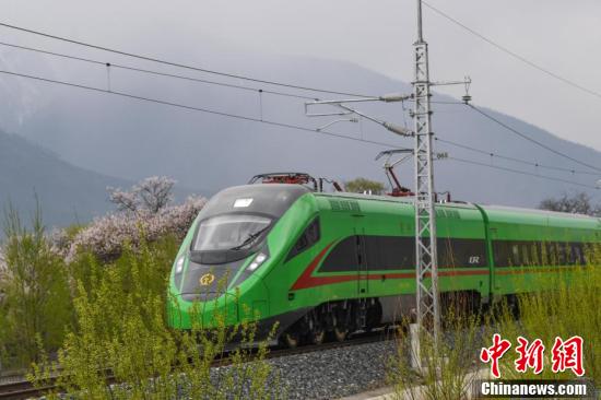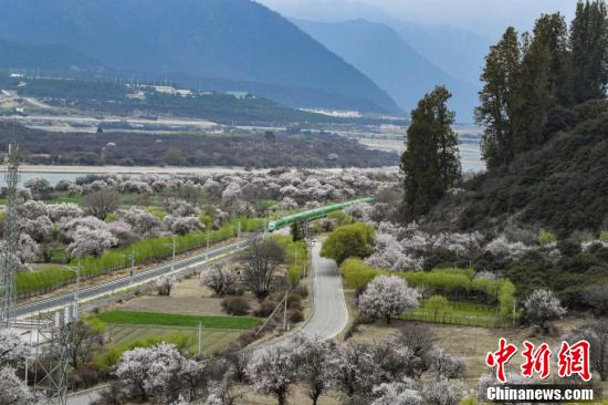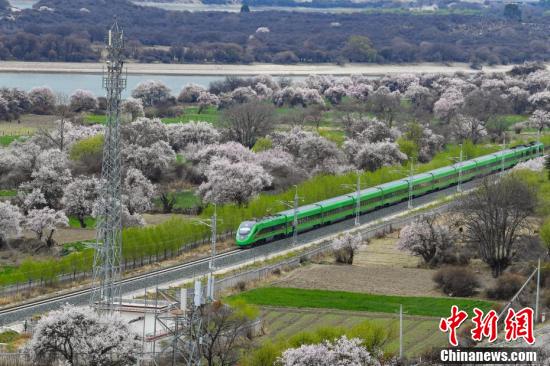 復(fù)興號動車組不僅是一種便捷的交通方式,更成為了一種獨(dú)特的旅游體驗,讓游客能夠近距離欣賞到西藏林芝春季獨(dú)特的自然美景。圖為穿梭在桃花林中的拉林鐵路高原復(fù)興號。