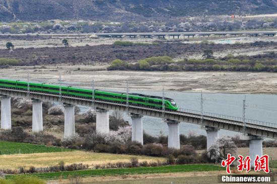 據(jù)悉,拉林鐵路是一條連接西藏拉薩市與林芝市的國鐵Ⅰ級單線電氣化鐵路,全長435公里,設(shè)計時速160公里,于2021年6月25日開通運(yùn)營。圖為穿梭在桃花林中的拉林鐵路高原復(fù)興號。