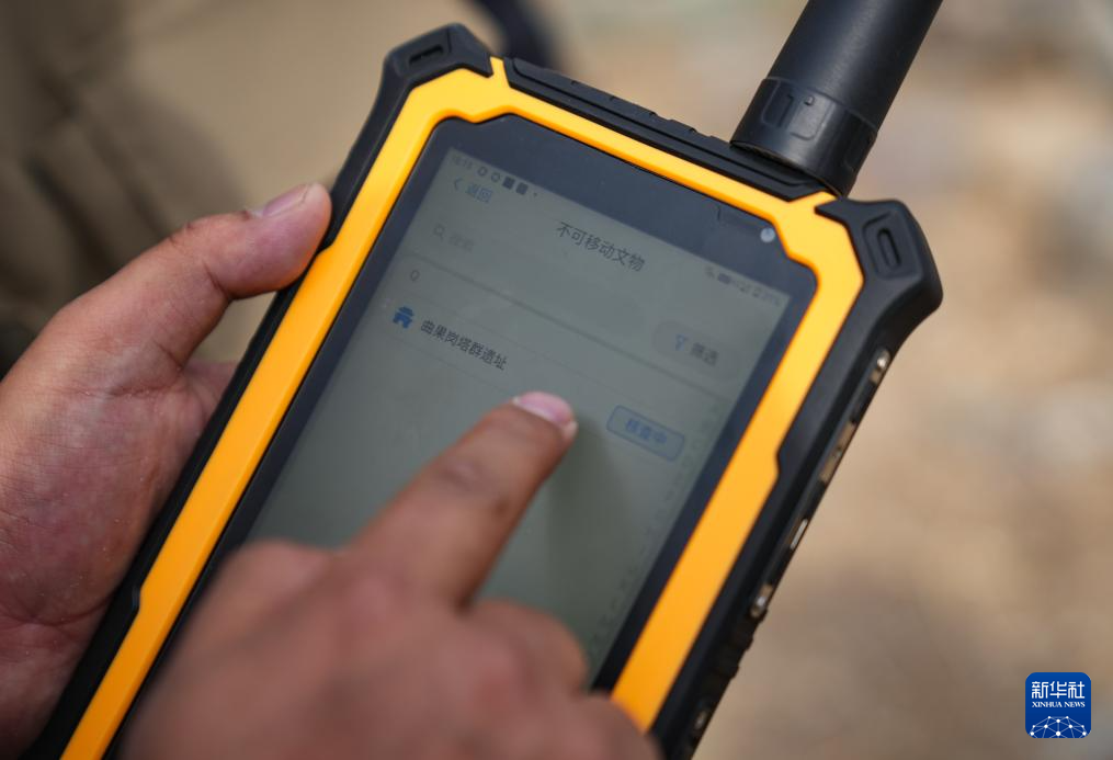 4月11日,普查人員手持移動(dòng)端數(shù)據(jù)采集設(shè)備在曲果崗塔群遺址現(xiàn)場(chǎng)開(kāi)展數(shù)據(jù)采集。新華社記者 晉美多吉 攝