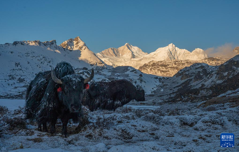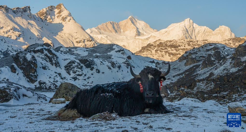 這是在嘎瑪溝中拍攝的牦牛和雪山(4月17日攝)。新華社記者 丁增尼達 攝
