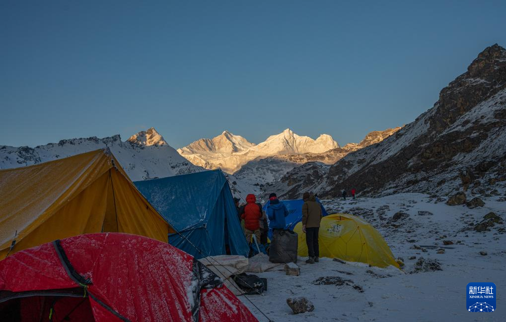 游客在嘎瑪溝中的曉烏措營地觀賞“日照金山”景象(4月17日攝)。新華社記者 楊帆 攝