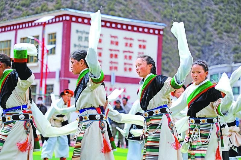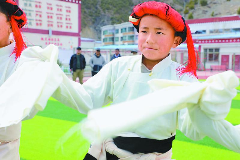 圖為認真排練“索榮卓舞”的若達鄉(xiāng)小學學生。記者 曲珍 通訊員 益西卓嘎 攝