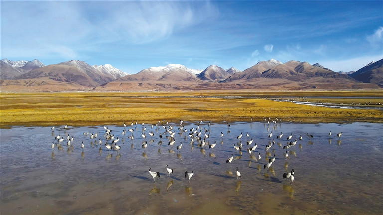 數(shù)量逐年增多的黑頸鶴成群遷徙停歇或繁殖,正是對當雄縣生態(tài)環(huán)境持續(xù)向好的最美注腳。當雄縣自然資源局(林業(yè)和草原局)局長楊光富說:“近年來,當雄縣始終堅持‘綠水青山就是金山銀山、冰天雪地也是金山銀山’的發(fā)展理念,率先在拉薩市成功創(chuàng)建全國生態(tài)文明示范縣和‘兩山’實踐創(chuàng)新基地。這兩塊金字招牌充分體現(xiàn)了當雄的生態(tài)底色。下一步,我們將在全縣草原生態(tài)保護中重點突出阿熱濕地保護,探索濕地黑頸鶴、斑頭雁等珍稀野生動物活動的特點規(guī)律,促進濕地保護管理與濕地資源合理利用有機融合,確保探索形成守綠換金、添綠增金、點綠成金的‘兩山’轉(zhuǎn)化模式?!?/p>
