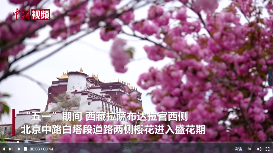 “五一”期間,西藏拉薩布達(dá)拉宮西側(cè)北京中路白塔段道路兩側(cè)櫻花進(jìn)入盛花期,花枝爛漫,引來不少過往市民、游客駐足拍照“打卡”。北京中路附近正好有個(gè)公交站臺(tái)白塔站,市民、游客可花下乘車,春夏之交,高原景色宜人。(記者 江飛波 制作 劉鵬)