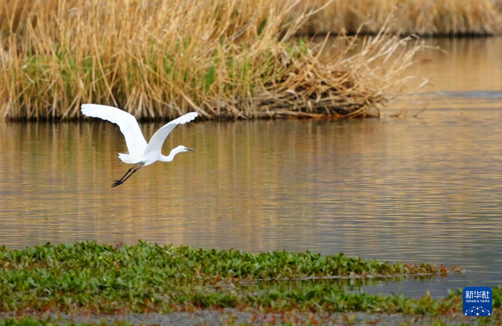 ?一只白鷺在拉魯濕地水面上飛翔(5月5日攝)。新華社記者 張汝鋒 攝