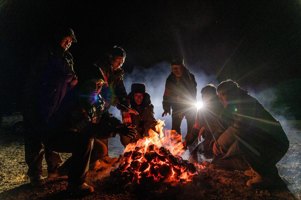 野生動(dòng)物專業(yè)管護(hù)隊(duì)員在宿營地的寒夜里烤火,燃料是野牦牛的糞便(5月10日攝)。新華社記者 丁增尼達(dá) 攝