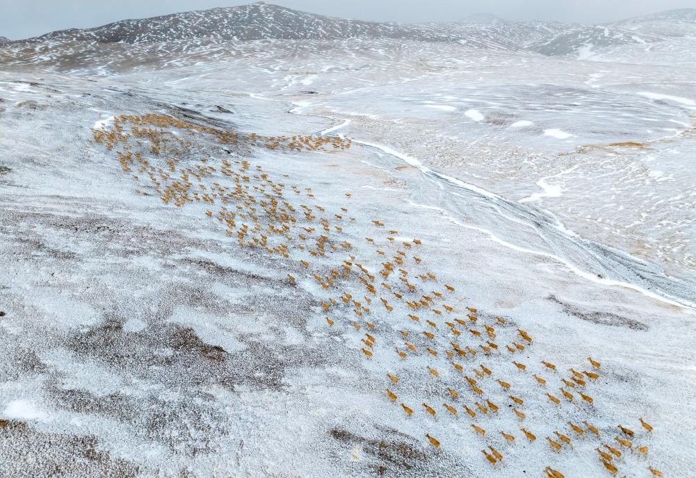 大群藏羚羊正在向產(chǎn)羔地遷徙(無人機(jī)照片,5月10日攝)。新華社記者 姜帆 攝