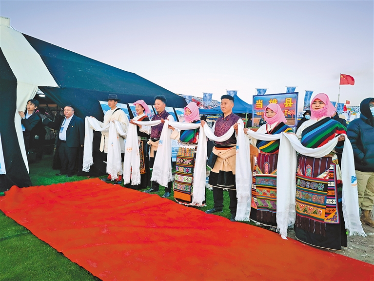 開湖意味著旅游旺季的到來。當(dāng)雄縣、尼木縣、曲水縣、城關(guān)區(qū)等縣區(qū)都搭起彩色帳篷,展示特色美食、文創(chuàng)產(chǎn)品和非遺文化。各縣區(qū)的文旅局長們集體“出攤”,向來賓做著熱情細致的宣介。林周縣的帳篷前,4位藏族農(nóng)牧民跳起舞蹈,這是從夯墻勞作中誕生的傳統(tǒng)舞蹈“阿嘎舞”;達孜區(qū)展出青稞精釀白啤酒、以黑頸鶴為靈感創(chuàng)作的文創(chuàng)產(chǎn)品、知名品牌的古檀香等特色商品;曲水縣在醒目位置放置著全域旅游手繪地圖、文旅產(chǎn)業(yè)招商引資項目介紹等手冊。