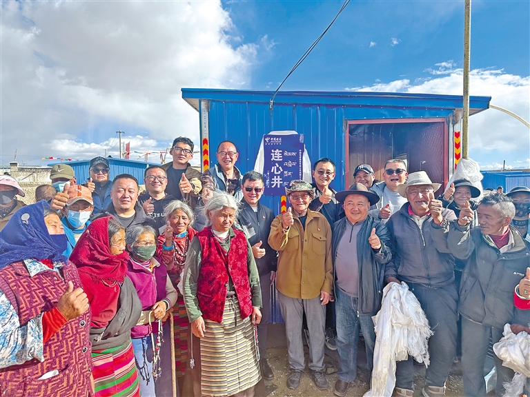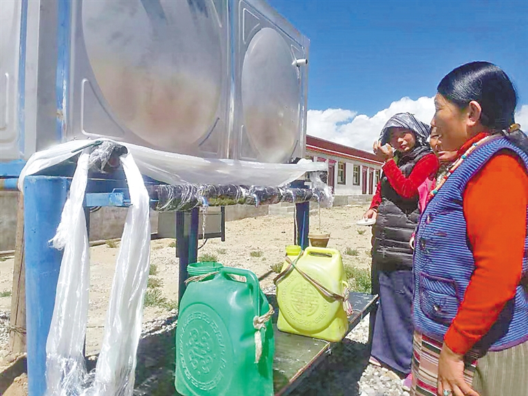 霍爾巴鄉(xiāng)群眾在中國(guó)電信西藏公司投資修建的扶貧項(xiàng)目機(jī)井取水。