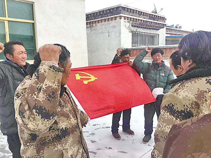 中國(guó)電信西藏公司駐霍爾巴鄉(xiāng)駐村工作隊(duì)與聯(lián)系點(diǎn)黨員干部重溫入黨宣誓。