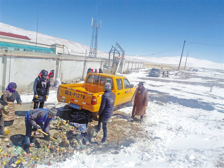 2017年3月,中國(guó)電信西藏公司駐霍爾巴鄉(xiāng)貢桑村工作隊(duì)組織群眾在219國(guó)道沿線清理垃圾。