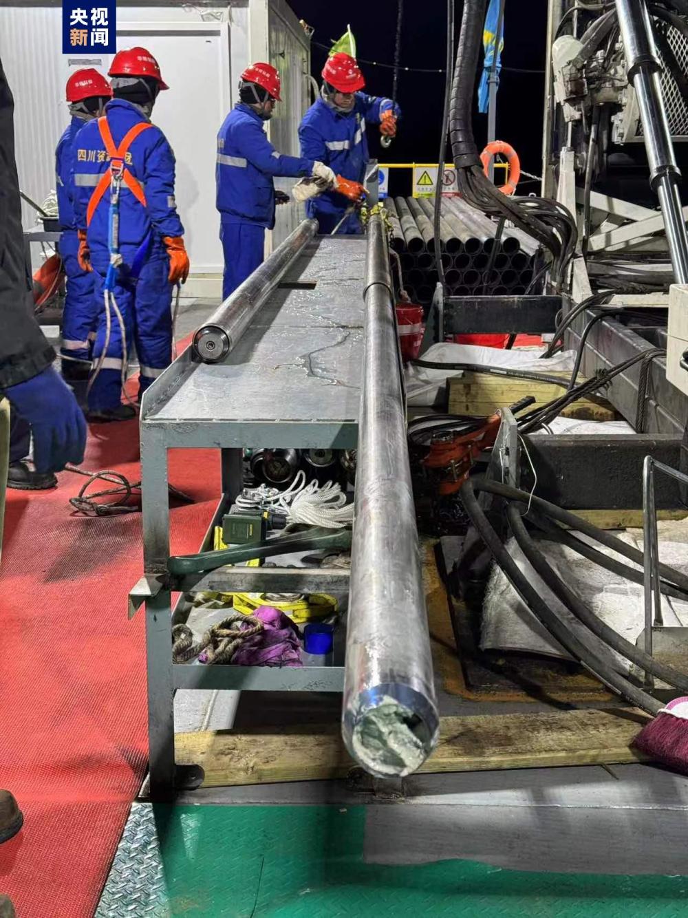 6月6日作為鉆芯的第一天,經(jīng)過不斷地調整和試驗,當晚23時20分,第一次正式鉆探開始,鉆頭深入到了水下95米左右的位置,在第一個點位開始鉆取湖泊巖芯。23時40分,科考團隊獲得了第一批湖泊巖心樣本??蒲袌F隊每次鉆取3米一段,通過24小時輪班不間斷作業(yè),截至7日早6時,已獲得9米長的巖芯。
