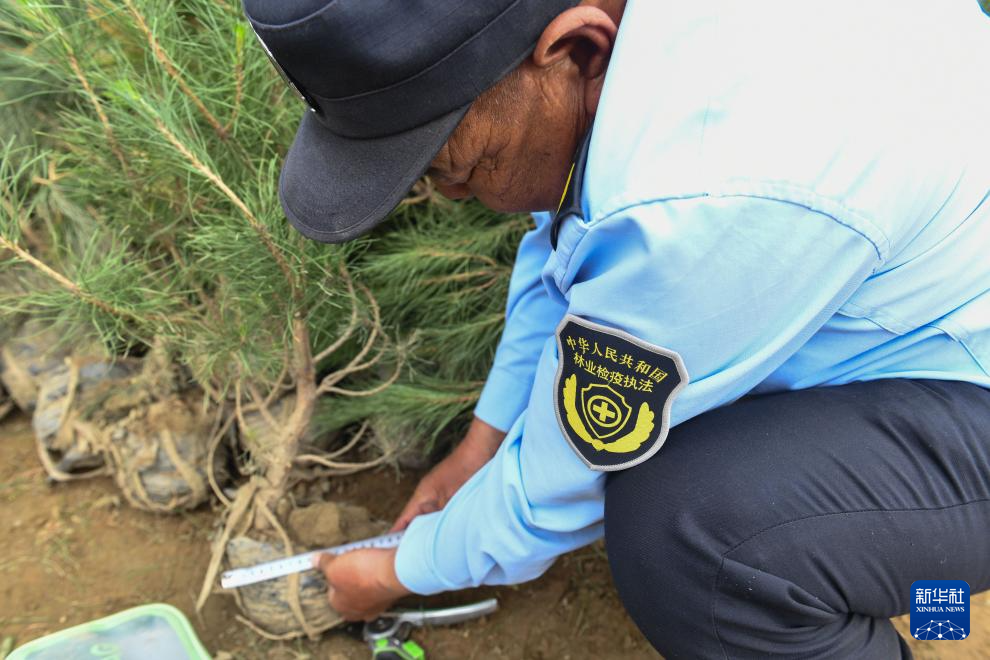 6月3日,在拉薩南北山綠化工程2024年度鞏固提升(貢嘎機場周邊山體)工程項目上,林業(yè)檢疫執(zhí)法工作人員在檢查樹苗根部土球是否達標。新華社記者 晉美多吉 攝