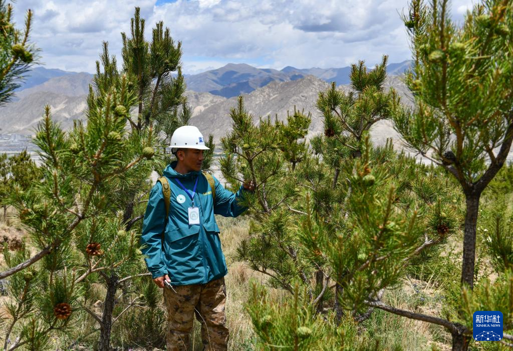 6月3日,拉薩南北山綠化工程2024年度鞏固提升(貢嘎機場周邊山體)工程項目上,第三方監(jiān)理人員在檢查樹木狀況。新華社記者 晉美多吉 攝