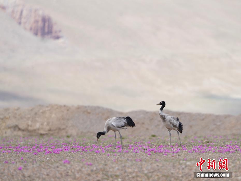 6月12日,西藏那曲市申扎縣黑頸鶴在花叢中覓食。申扎縣,平均海拔超過4500米,是黑頸鶴在中國的主要繁殖地之一。每年4月到6月,成群的黑頸鶴會(huì)來到這里,筑巢、孵化、養(yǎng)育下一代。近年來,為了保護(hù)這些珍貴的生靈,申扎縣采取了一系列措施,設(shè)立了監(jiān)測(cè)站,對(duì)黑頸鶴的棲息地進(jìn)行24小時(shí)監(jiān)控,確保它們的繁殖不受干擾。黑頸鶴是國家一級(jí)保護(hù)動(dòng)物,也是世界上唯一一種生長、繁殖在高原的鶴類。貢嘎來松 攝
