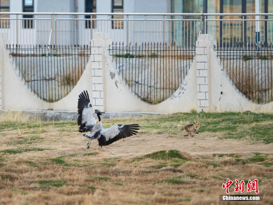 6月12日,西藏那曲市申扎縣濕地里一只黑頸鶴在驅(qū)趕狐貍。申扎縣,平均海拔超過4500米,是黑頸鶴在中國的主要繁殖地之一。每年4月到6月,成群的黑頸鶴會(huì)來到這里,筑巢、孵化、養(yǎng)育下一代。近年來,為了保護(hù)這些珍貴的生靈,申扎縣采取了一系列措施,設(shè)立了監(jiān)測(cè)站,對(duì)黑頸鶴的棲息地進(jìn)行24小時(shí)監(jiān)控,確保它們的繁殖不受干擾。黑頸鶴是國家一級(jí)保護(hù)動(dòng)物,也是世界上唯一一種生長、繁殖在高原的鶴類。貢嘎來松 攝