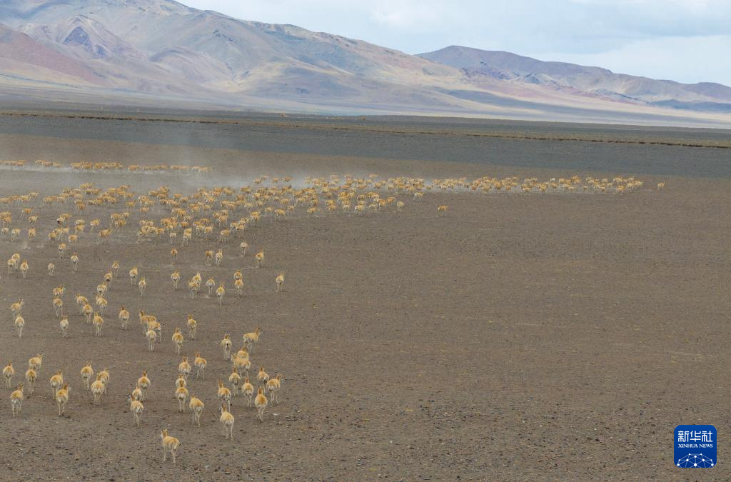 一群藏羚羊因感覺(jué)到危險(xiǎn)而開(kāi)始奔跑(無(wú)人機(jī)照片,6月13日攝)。新華社記者 姜帆 攝