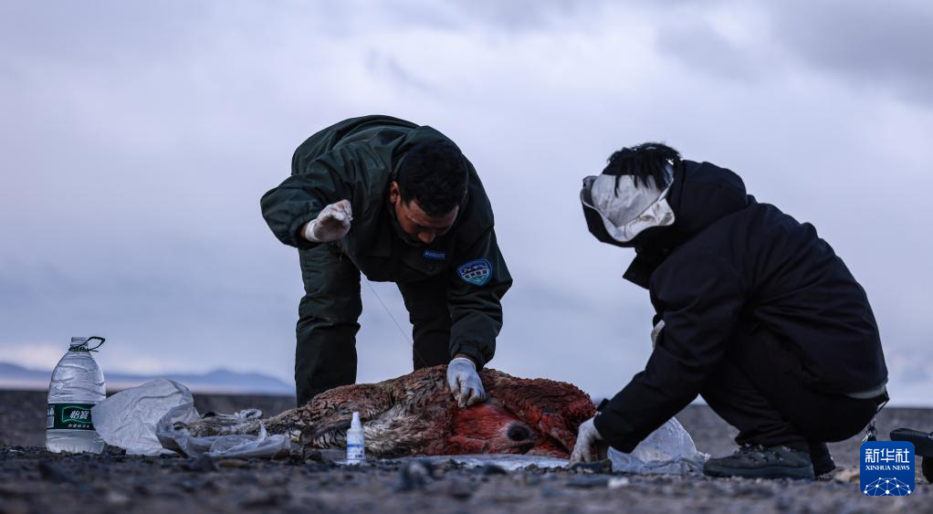 羌塘國(guó)家級(jí)自然保護(hù)區(qū)的野保員在救治受傷的母藏羚羊(6月14日攝)。新華社發(fā)(旦增攝)