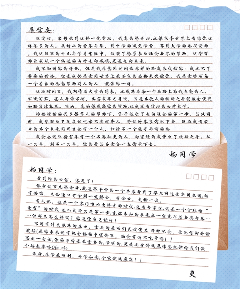 一位名叫葉珺的女生,看到江西勵(lì)志女孩佳琦的報(bào)道后,給這位千里之外素未謀面的“妹妹”寫了一封信,“我本來不輕易跟別人說自己的經(jīng)歷,但是看到佳琦的情況后特別感同身受,我覺得將自己的心聲傳達(dá)給這個(gè)小妹妹很有意義。”