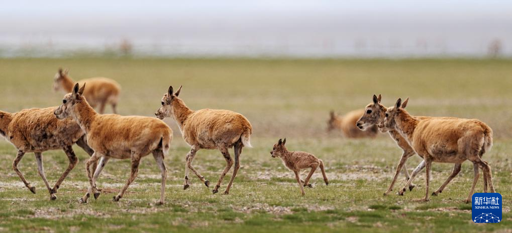 魯確塘草原上,藏羚羊護(hù)著剛出生的孩子(6月17日攝)。新華社記者 晉美多吉 攝