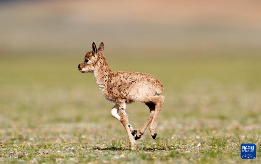6月17日,在魯確塘草原,一只剛出生不久的小藏羚羊在草地上奔跑。新華社記者 費(fèi)茂華 攝??