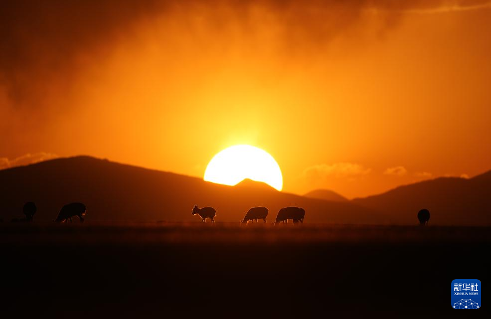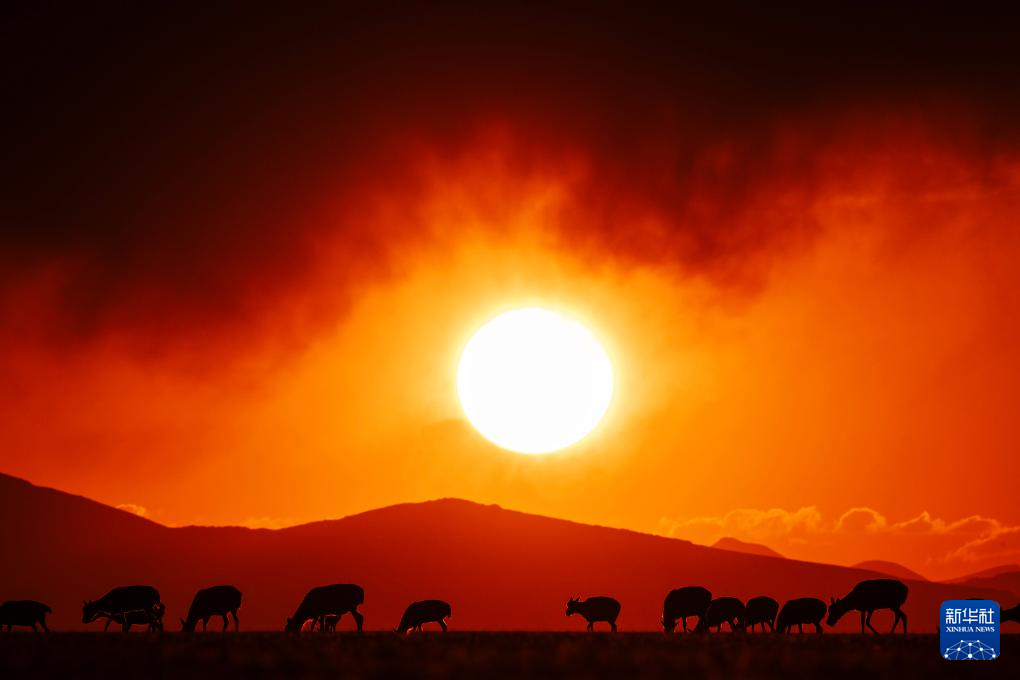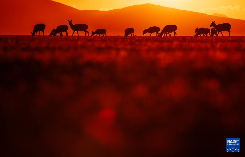 在魯確塘草原上,待產(chǎn)的藏羚羊在霞光的包圍中進(jìn)食(6月16日攝)。新華社記者 費(fèi)茂華 攝