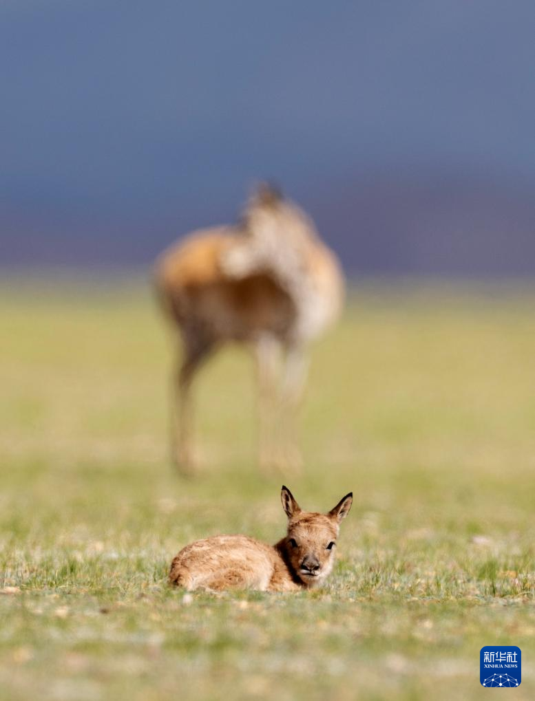 6月17日,在魯確塘草原,出生不久的小藏羚羊趴在草地上休息,一只母藏羚羊在一旁守護(hù)。新華社記者 費(fèi)茂華 攝??