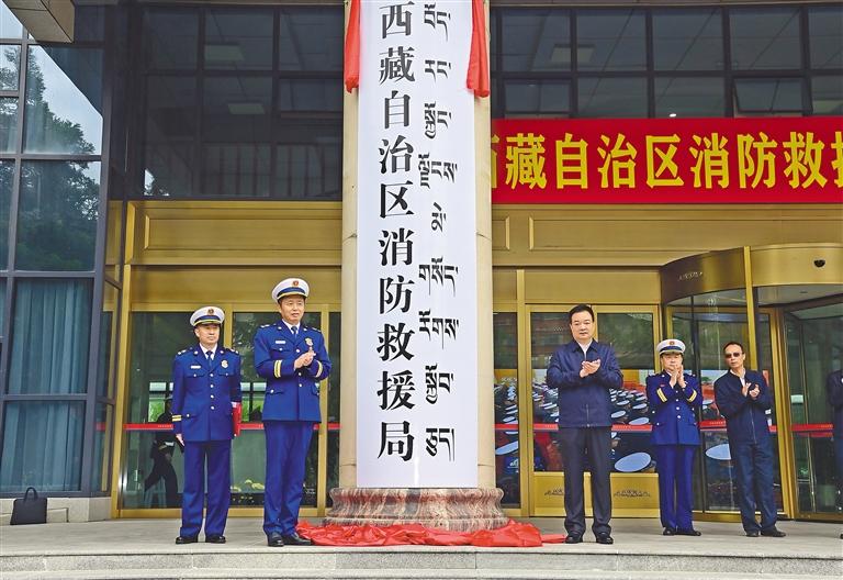 6月18日上午,自治區(qū)黨委書記王君正前往自治區(qū)消防救援總隊調(diào)研。這是王君正為西藏自治區(qū)消防救援局揭牌。本報記者 旦增西旦 攝