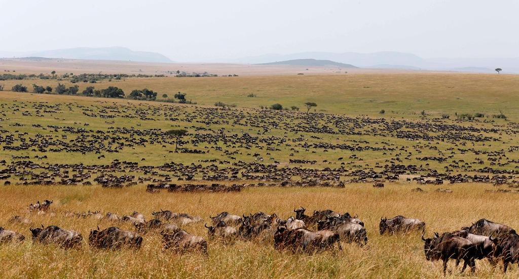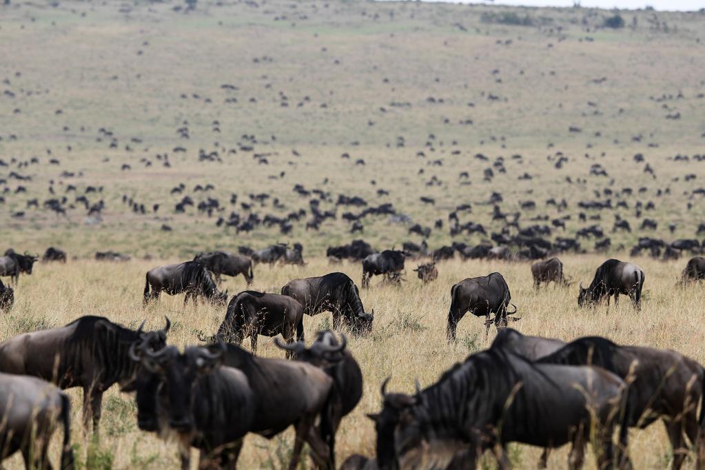 ↑ 在馬賽馬拉國(guó)家保護(hù)區(qū),遷徙中的野生動(dòng)物在草原上覓食。