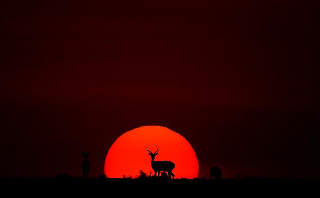↑ 在馬賽馬拉國(guó)家保護(hù)區(qū),遷徙中的野生動(dòng)物在夕陽(yáng)下覓食。