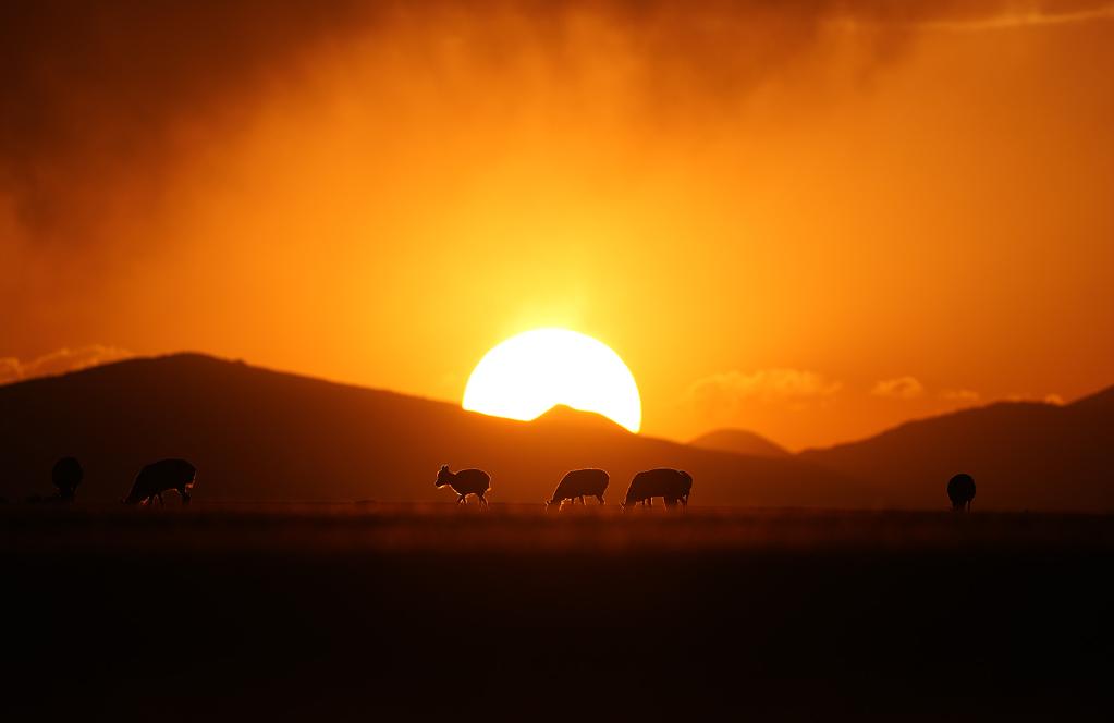 ↑ 在羌塘國(guó)家級(jí)自然保護(hù)區(qū),藏羚羊在夕陽(yáng)下覓食。