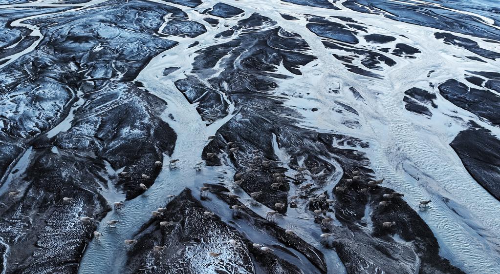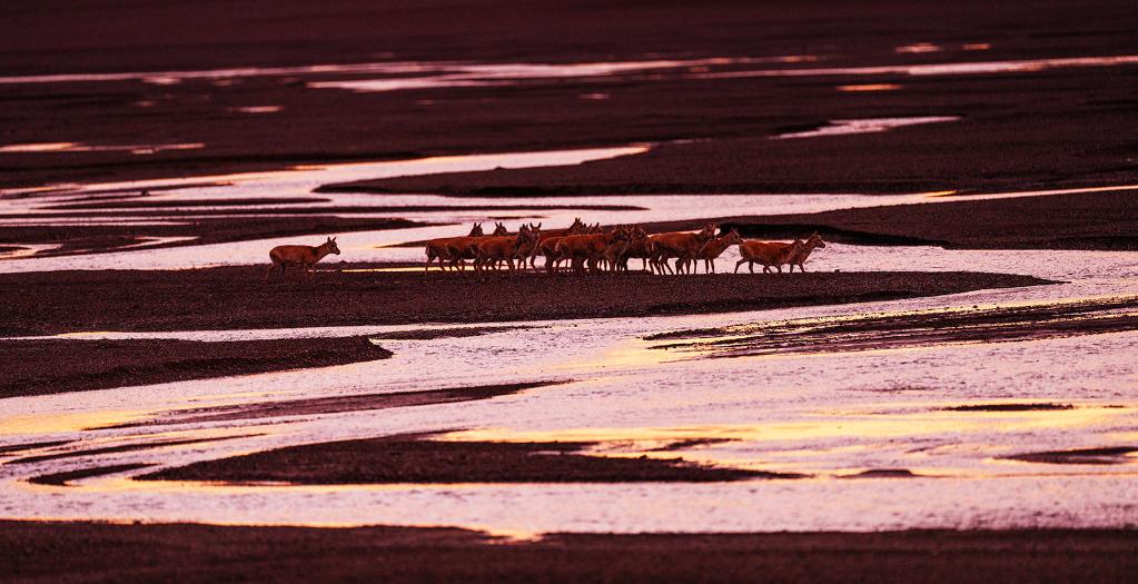 ↑ 在羌塘國(guó)家級(jí)自然保護(hù)區(qū),藏羚羊越過(guò)甜水河,前往“產(chǎn)房”。