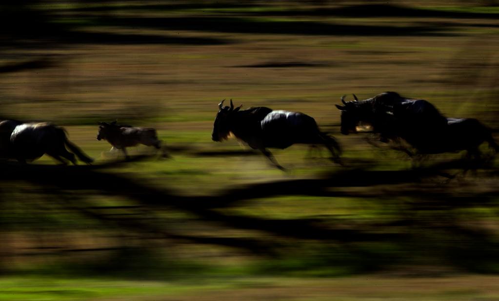 ↑ 在馬賽馬拉國(guó)家保護(hù)區(qū),遷徙中的角馬因?yàn)楦惺艿侥撤N危險(xiǎn)而奮力奔跑。