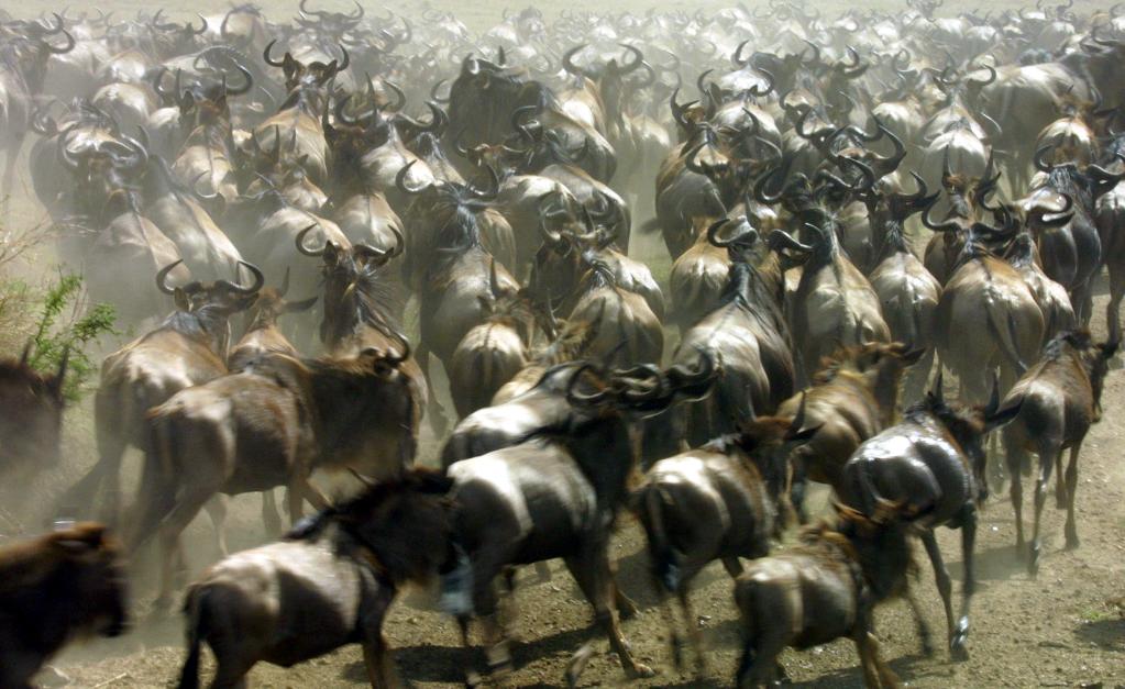 在千里之外的非洲,每年7月至9月,為了追逐水源和青草,數(shù)百萬(wàn)頭角馬、斑馬和羚羊等食草動(dòng)物組成一支浩浩蕩蕩的遷徙大軍,從坦桑尼亞塞倫蓋蒂國(guó)家公園向肯尼亞馬賽馬拉國(guó)家保護(hù)區(qū)遷徙,這就是東非野生動(dòng)物大遷徙。當(dāng)數(shù)百萬(wàn)頭野生動(dòng)物從面積廣闊達(dá)數(shù)萬(wàn)平方公里的塞倫蓋蒂,遷徙到僅有不到2000平方公里的馬賽馬拉的時(shí)候,遷徙達(dá)到高潮。
