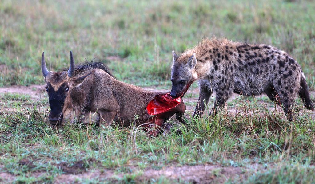 ↑ 在馬賽馬拉國(guó)家保護(hù)區(qū),一頭遷徙中的角馬成了鬣狗的食物。在角馬遷徙過(guò)程中,獅子、獵豹、花豹、鬣狗以及馬拉河中的鱷魚(yú)等掠食動(dòng)物環(huán)伺其周,伺機(jī)而動(dòng)。