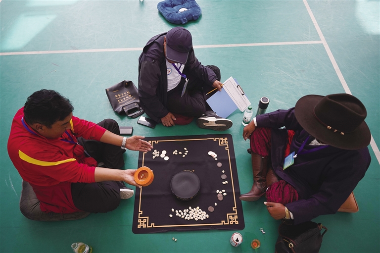 當(dāng)日,“吉韌”“秀茲”等項目一同開賽?! 凹g”也叫藏式克郎球,是藏族的一種彈指運(yùn)動。比賽在一張邊長約1米的正方形木桌球臺上進(jìn)行,球臺四角有4個小洞,黑、白兩種扁圓形球子各9個,另有1個紅色球子放置在球臺中心,1個白色母球供雙方彈擊球子所用。