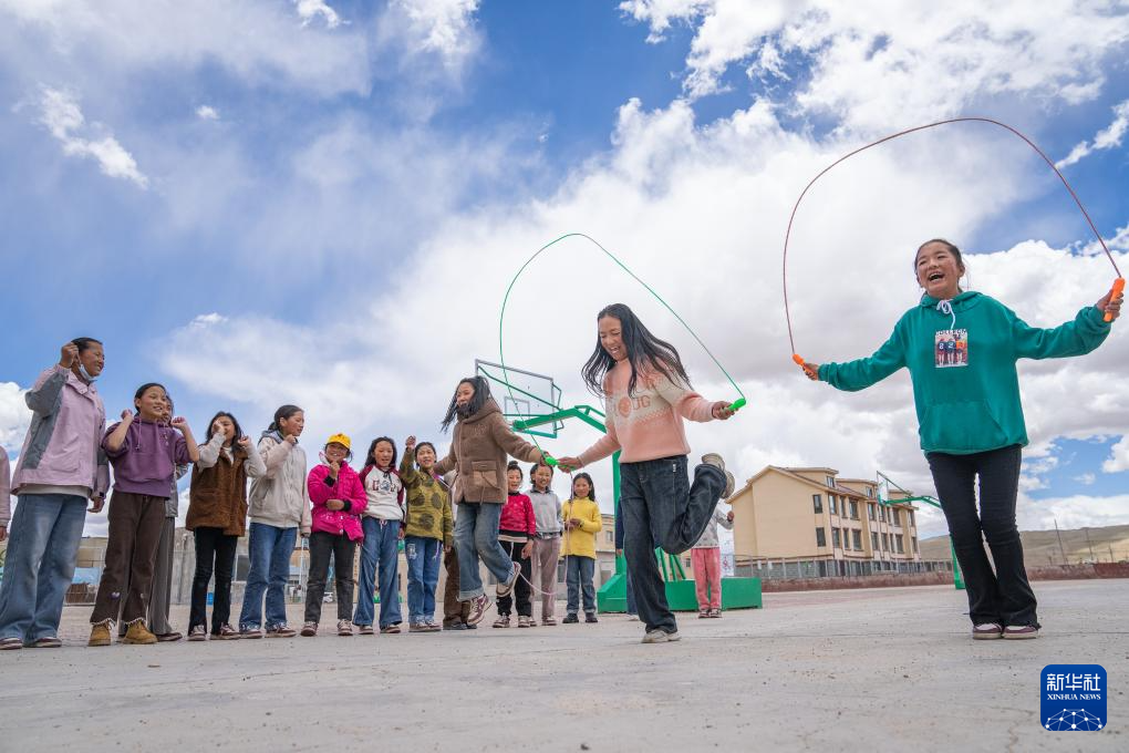 班戈縣中石化小學(xué)學(xué)生尼瑪措姆(右二)和同學(xué)們在操場上跳繩(6月22日攝)。新華社記者 丁增尼達 攝