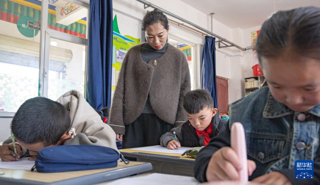 班戈縣中石化小學(xué)的老師德吉措姆在督促學(xué)生完成試卷(6月22日攝)。新華社記者 丁增尼達 攝