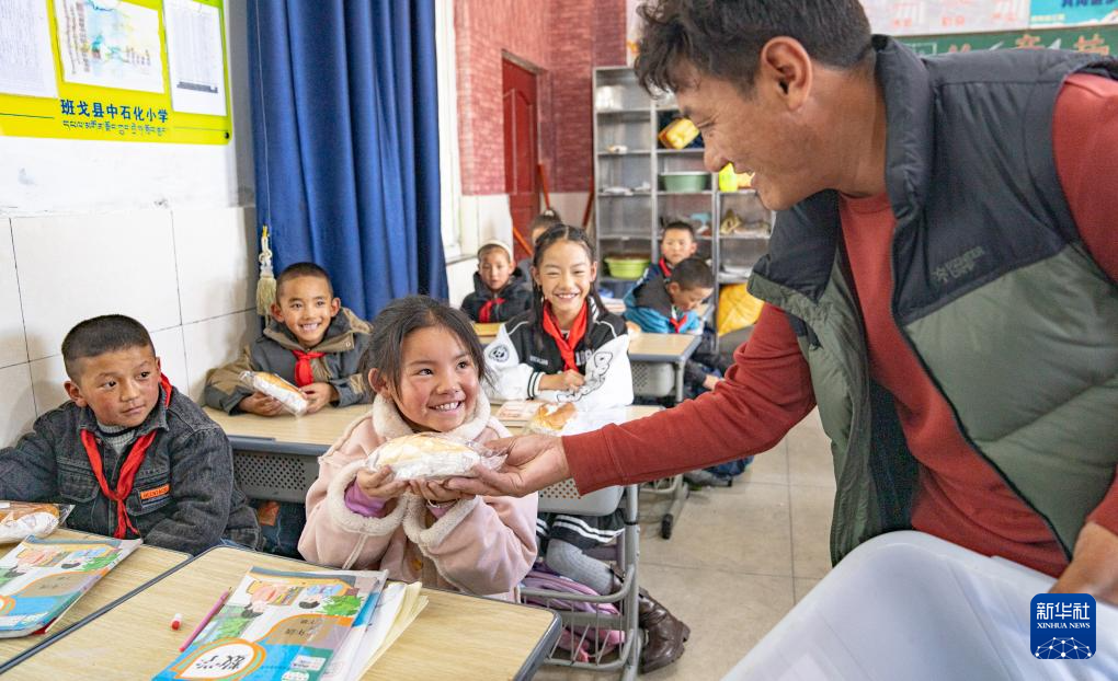 班戈縣中石化小學(xué)后勤副校長尼旦為學(xué)生們分發(fā)營養(yǎng)餐(6月22日攝)。新華社記者 丁增尼達 攝