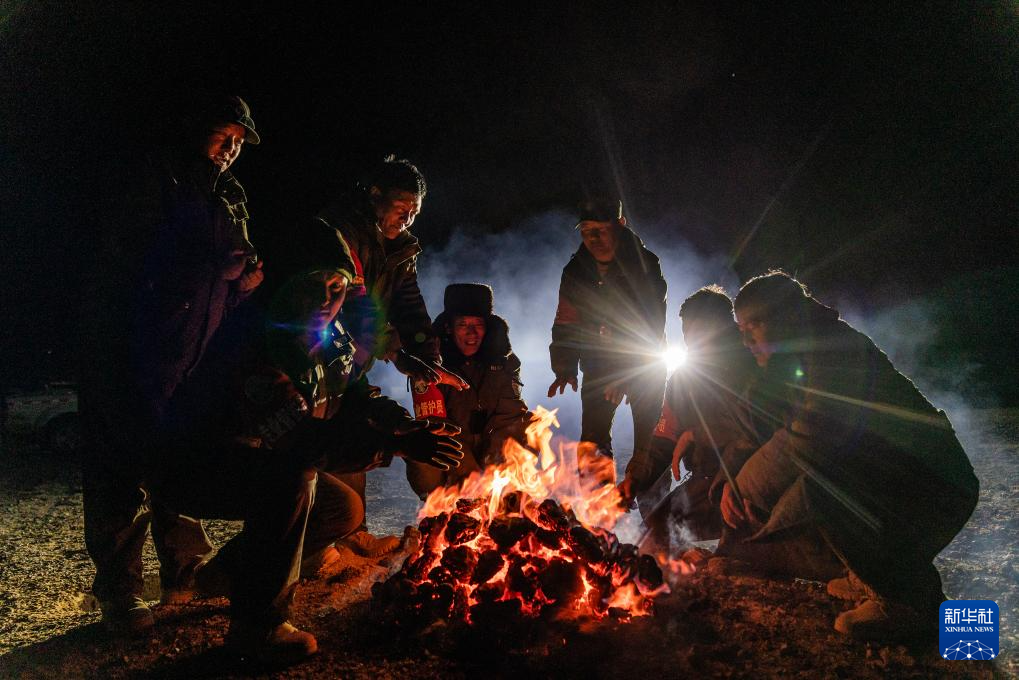 5月10日,野生動物專業(yè)管護(hù)隊(duì)員在宿營地用野牦牛糞烤火取暖。新華社記者 丁增尼達(dá) 攝
