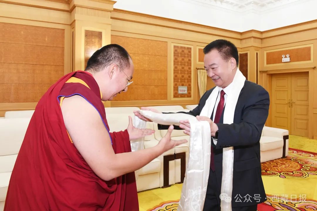 6月26日下午,自治區(qū)黨委書記王君正在拉薩會見班禪額爾德尼·確吉杰布。這是王君正與班禪額爾德尼·確吉杰布互獻(xiàn)哈達(dá)。記者 李洲 攝